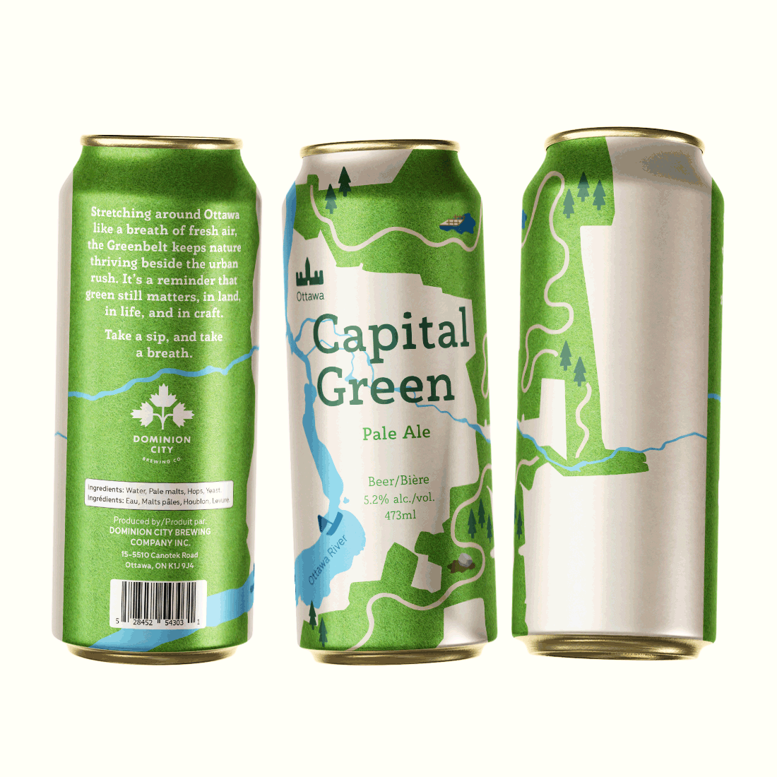 Inspired by the Ottawa Greenbelt, Capital Green is a bold, bright, and fun new beer can design for Dominion City. Designed to feel fresh in hand, it represents the greener ways of the craft.