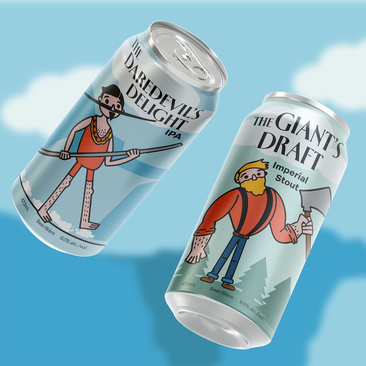 Two beer can labels for Tooth & Nail Brewing, built in Illustrator & Photoshop, celebrating Ottawa legends The Great Farini & Joe Mufferaw with exaggerated illustration and production-ready dielines.