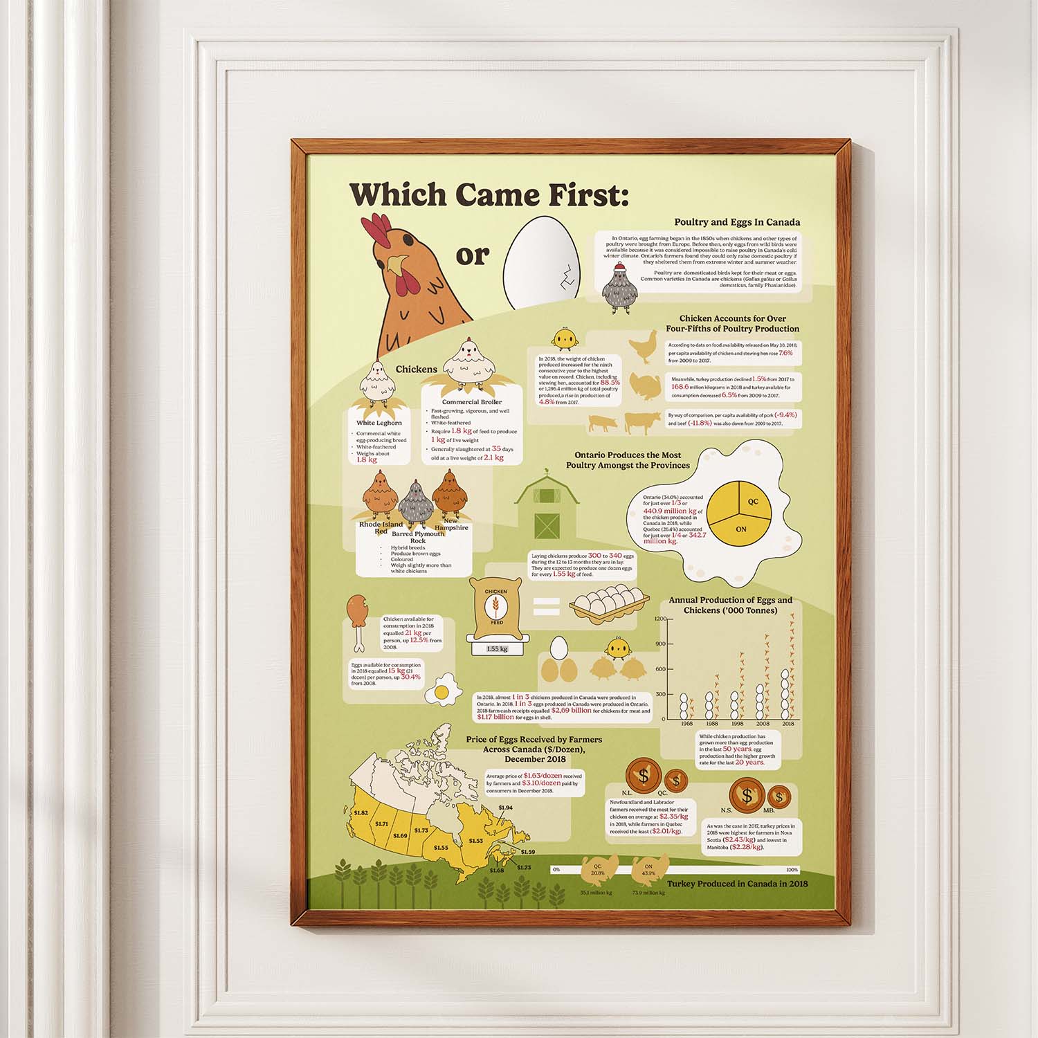 An infographic transforming Canadian poultry & egg production data into clear visuals—custom illustrations, charts, and maps—built in Illustrator & Photoshop for digital and print.