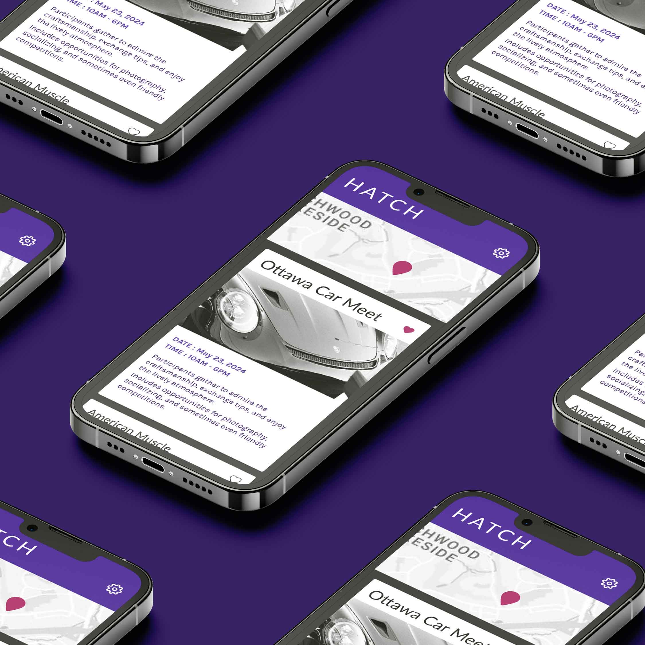 A UX/UI project designing Hatch, a community app for car enthusiasts to share photos, join forums, and discover local meetups—creating a space built around passion, connection, and community.