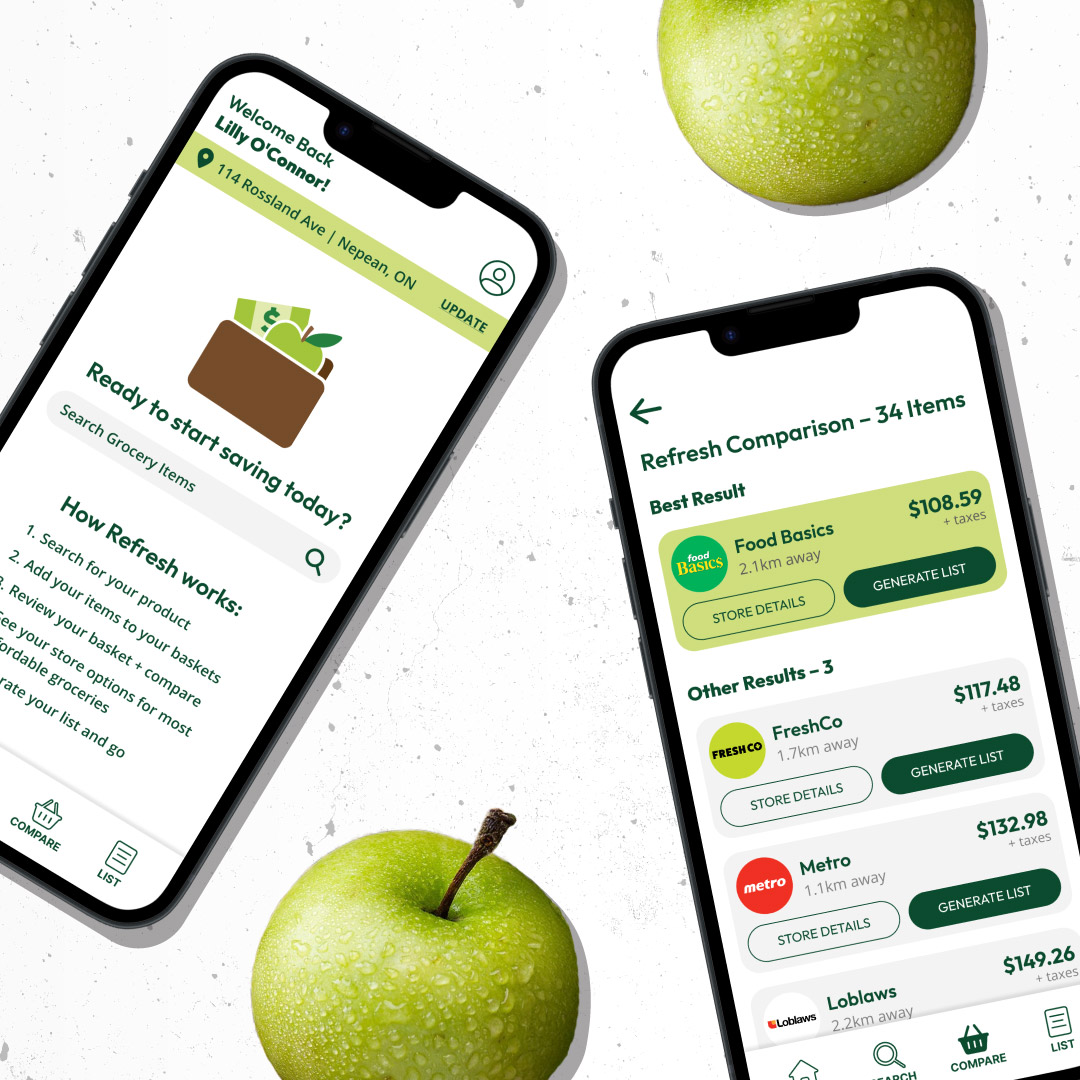 The Refresh app helps users know the best place to shop for their groceries by comparing their shopping list to stores in their area. This innovative app saves users both time and money.