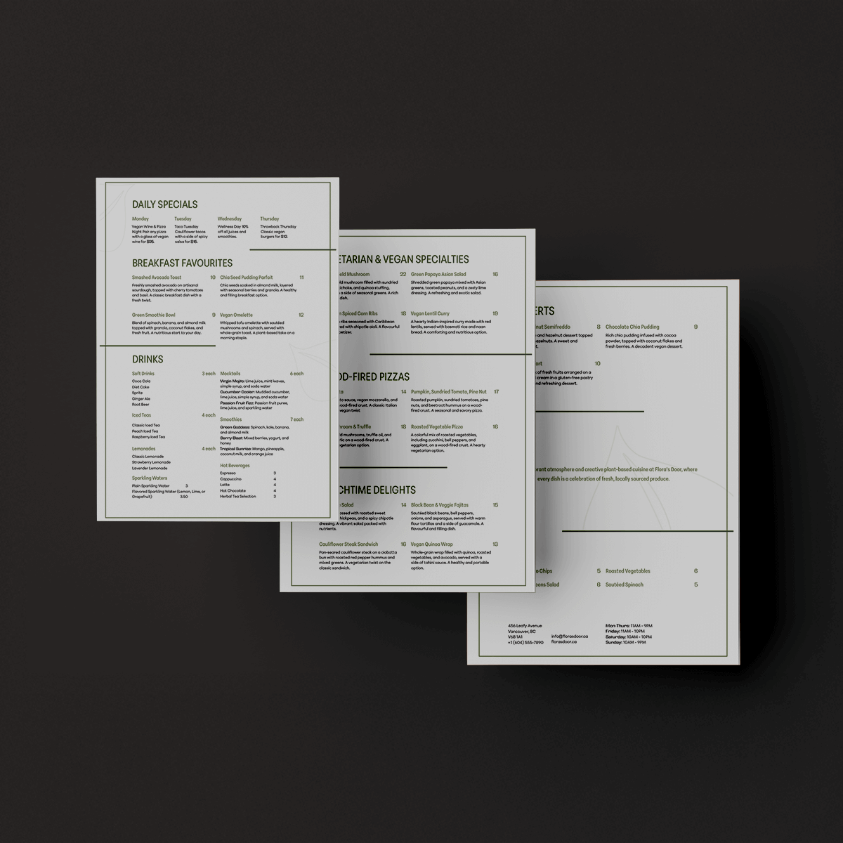 A modern three-page menu system designed with strong hierarchy and structured layout, balancing bold branding with clear, scannable content and a tactile wood-mounted presentation.