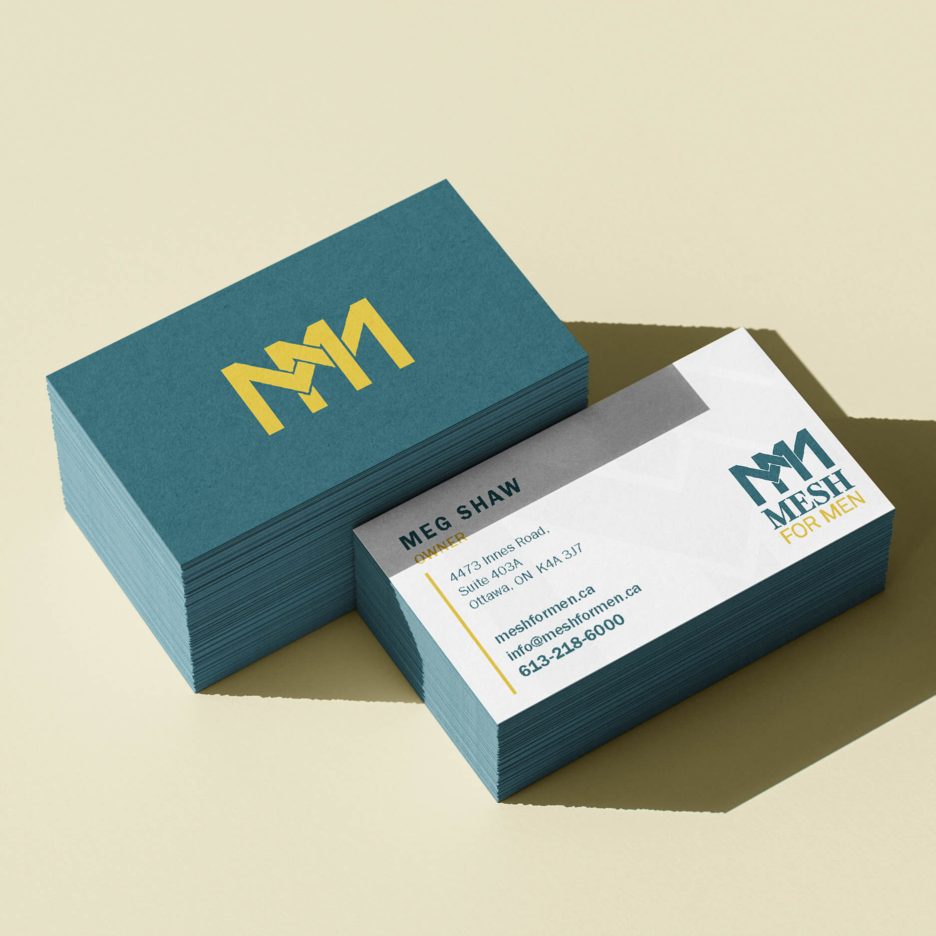 Redesigned Mesh for Men's logo with a minimalist interlocking M monogram. The refined teal and gold palette with serif typography projects trust and professionalism for this hair systems brand.