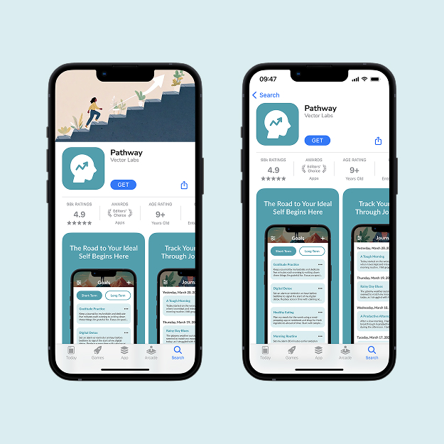 Designed Pathway, a self-improvement app with an intuitive interface that prioritizes clarity over complex metrics. Features goal tracking, journaling, and progress views with calming visuals.