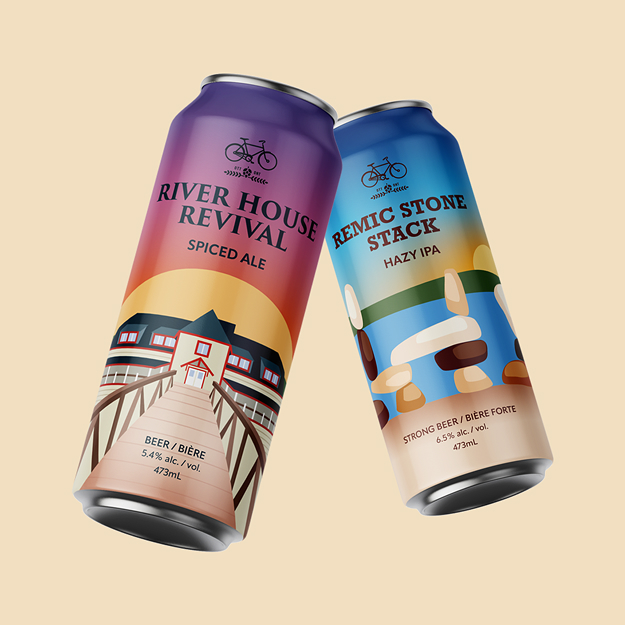Designed Ottawa-themed beer labels for Bicycle Craft Brewery featuring River House and Remic Rapids with complementary sunset/sunrise imagery and the brewery's clean aesthetic.